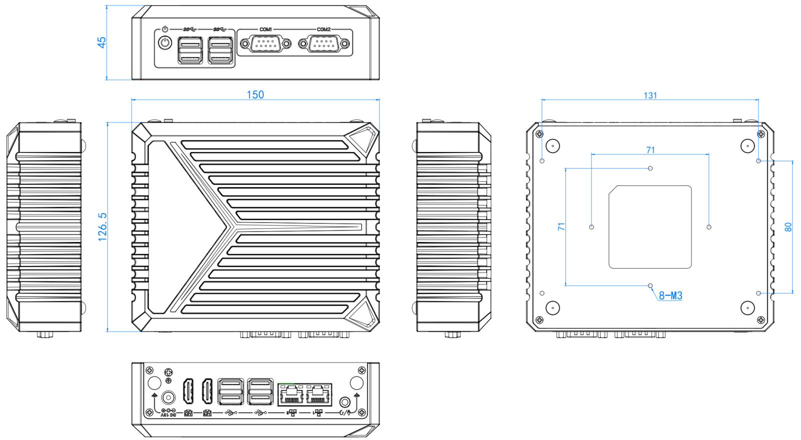 | 前面板I/O端口 | 1个电源开关,4个USB3.2,2个COM口(RS232/RS485模式) |